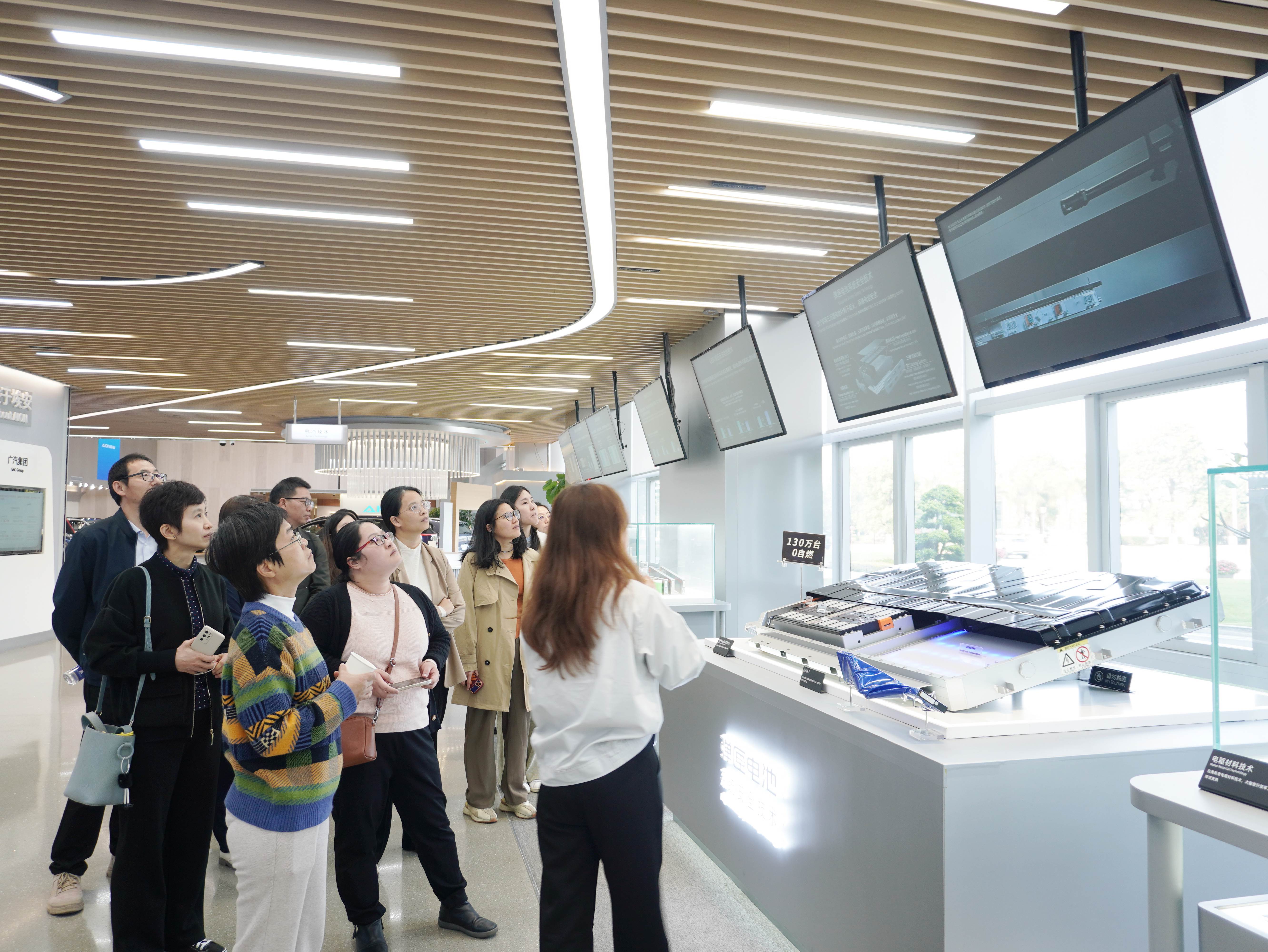 抵达广汽埃安总部后,充满科技感的产品展厅立即吸引了众人目光。现场陈列的多款新能源汽车,全面展现了广汽埃安的研发实力,企业技术顾问重点介绍了车型特点及电池、电机、电控“三电”核心技术的突破。随后走进智能建造生产车间,更让大家直观感受了新质生产力的活力。自动化生产线、精准作业的机械臂、智能穿梭的AGV小车及全流程监控系统,构成了高效智能的生产场景。